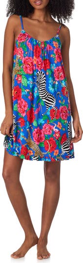 Enjoy slow mornings and early nights in a playfully print chemise cut in a slip silhouette with a scoop back and adjustable straps at the shoulders.