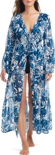 Saunter between cabana and tiki bar in this printed cover-up dress that's cinched with trailing tassel ties for an insouciant and very beachy look.