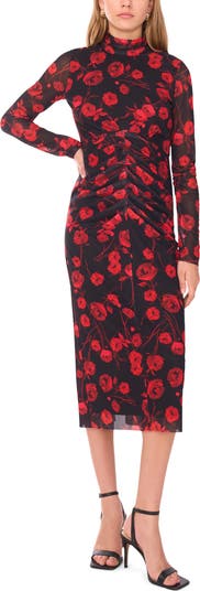 Rich roses romance this figure-skimming midi cut from airy, breathable mesh and accented with rippled ruching.