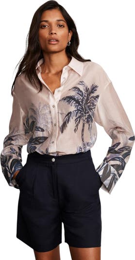 Palm print longline shirt with a classic collar, long sleeves, buttoned cuffs and a button fastening through the front.