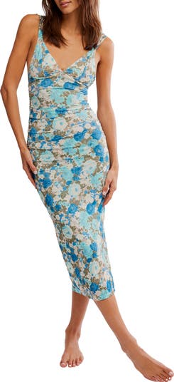 Rippled ruching enhances the figure-sculpting fit of this gauzy mesh dress accented with an airy side slit for easy movement.