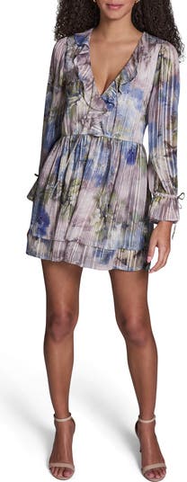 Shimmering metallic threads elevate this light and lovely mini romanced by watercolor blooms and accented with floaty frills.