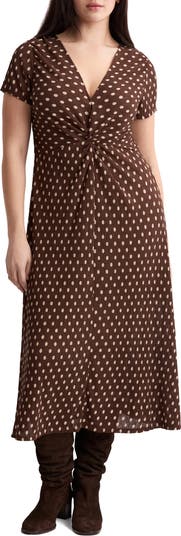 A front twist shapes the silhouette of this soft midi sprinkled with spirited dots for a celebratory vibe.