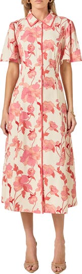 Blushing blooms enhance the charm of this lightweight midi framed by fluttering sleeves and finished with a drapey A-line skirt.