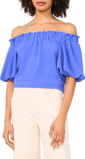 Puff sleeves frame this playful off-the-shoulder top fashioned from a gracefully draped crinkled twill.