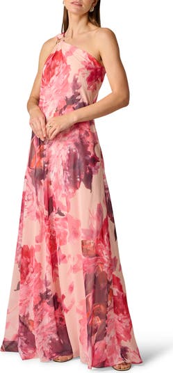 Blossoming flowers romance this shoulder-baring gown cut from soft skin-skimming chiffon and accented with a flowy back drape for graceful movement.