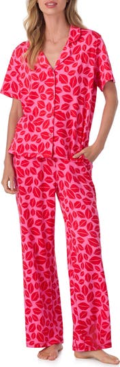 Slip under the sheets in the supersoft splendor of these stretchy pajamas featuring a button-up shirt and matching straight-leg pants.