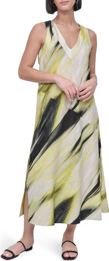 A bold brushstroke print energizes this breezy vacation-perfect maxi cut from crisp, lightweight linen and finished with airy slits for easy movement.