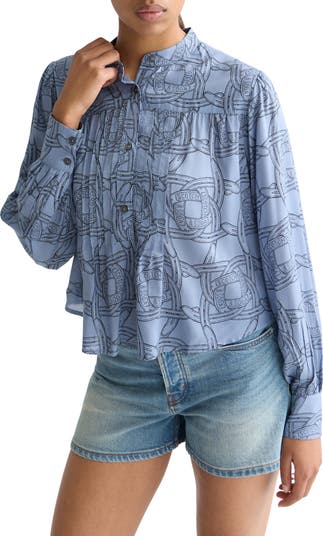 Sharp pintucks add texture to this crisp printed shirt framed by billowed sleeves.