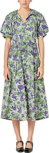Charming puff sleeves frame this crisp poplin midi covered in a garden of blooms and punctuated with inverted pleats for easy movement.