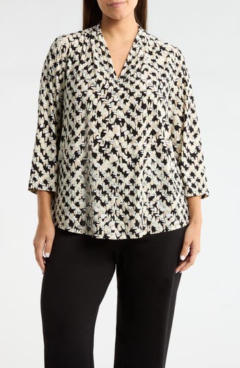 An abstract print and pleats at the V-neckline bring polished style to a soft-and-stretchy top that goes from desk to dinner with ease.