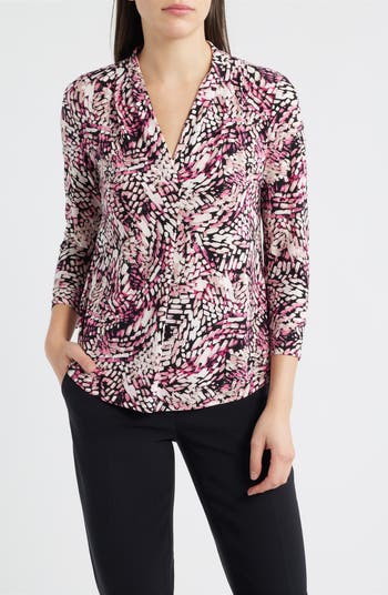 An abstract print and pleats at the V-neckline bring polished style to a soft-and-stretchy top that goes from desk to dinner with ease.