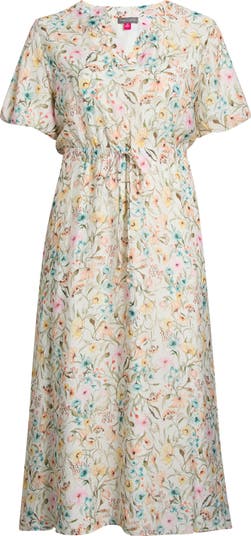 Charming puff sleeves frame the silhouette of this lightweight maxi patterned in wending wildflowers and set with an easy-adjust elasticized drawstring waist.
