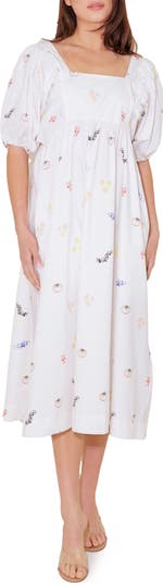 Voluminous puff sleeves sweeten the silhouette of this crisp poplin midi made with a flared skirt that sways with every step.
