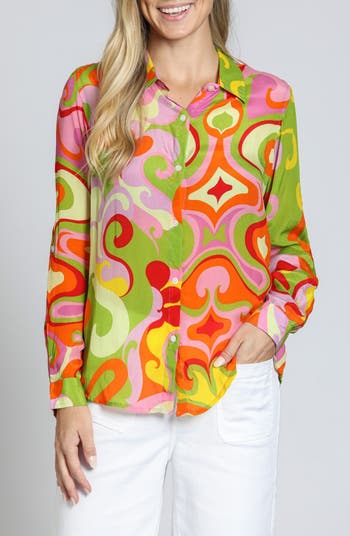 A fabulous retro print energizes an airy, woven button-up shirt designed with roll-tab sleeves and a high-low hem.
