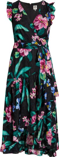 Vivid tropical blooms energize this sash-belted maxi styled in a faux-wrap, high-low silhouette framed with ruffle-trimmed cap sleeves and finished with a high/low hem that enhances the graceful movement.