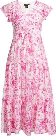 Blushing blooms enhance the enchantment of this lightweight maxi framed by fluttering sleeves and a frilled hem.