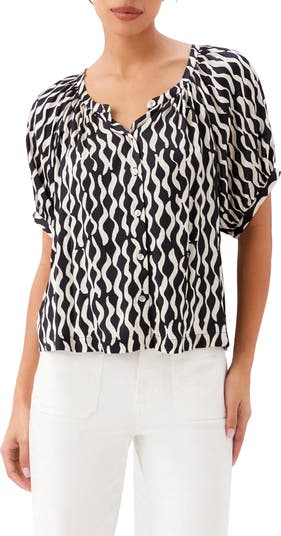 A relaxed button-up top made from polished satin is splashed in wavy stripes and framed by billowy elbow-length sleeves.