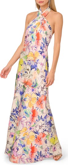 Brushstroked blooms make an artful impression across a vibrant party gown designed with a face-framing halter neck.