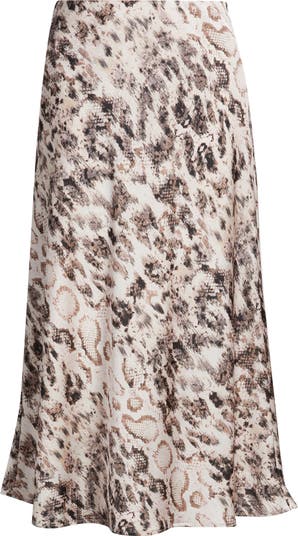 An allover print emboldens this flowy maxi skirt cut from glossy skin-skimming satin.
