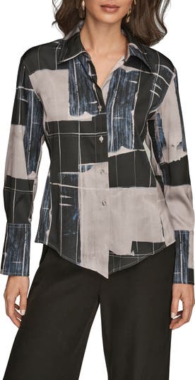 An abstract print emboldens this polished shirt cut from soft skin-skimming satin.