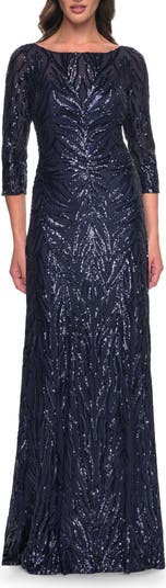 La Femme Print Sequin Gown with High Neckline and Sleeves, Main, color, Navy