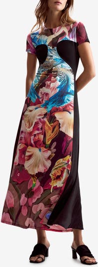 A vivid photorealistic print emboldens this figure-skimming maxi made with a kiss of stretch and finished with a flared skirt.