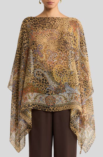 Swirling paisley over leopard spots brings lively patterning to this ethereal silk chiffon poncho that drapes gently at each side.