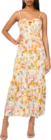 A blurred print enlivens this light and lovely maxi made with an airy front cutout and finished with a frilled hem for flouncy movement.