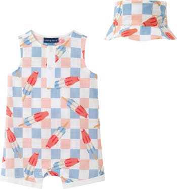 Sunny days will be extra sweet with this playfully printed romper and matching bucket hat in baby's collection.