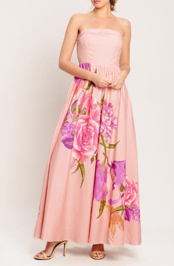 Vibrant blooms make an artistic statement on this strapless cotton dress that's ready for your next occasion.