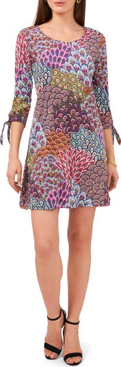 A playful mix of paisley fans out in an impressive display that resembles a peacock train all over this short swing dress detailed with ties at the cuffs.