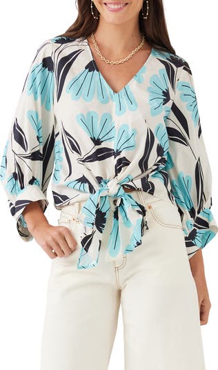 A drapey front tie shapes the silhouette of this flowy printed top framed by billowy sleeves and covered in a vivid print.