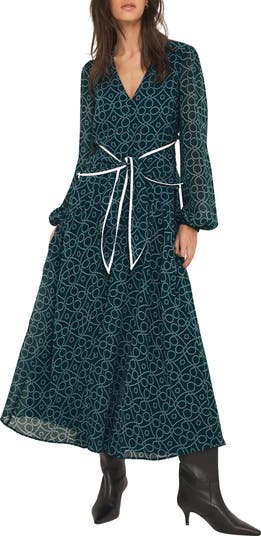 This print tie maxi dress combines effortless elegance with a flattering, feminine silhouette. Designed with a deep V-neckline and long sleeves, it features an allover graphic print that adds visual interest and modern appeal. The adjustable tie belt cinches the waist to create a defined shape, while the flowing maxi-length skirt drapes beautifully for graceful movement. Versatile and polished, this dress is perfect for day-to-evening wear, whether styled with boots for a refined daytime look or dressed up for special occasions.