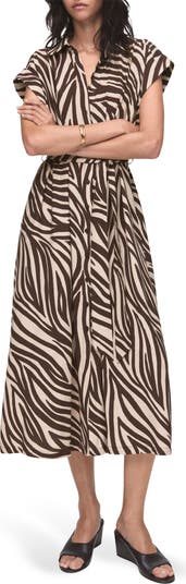 A defining tie shapes the silhouette of this polished lightweight shirtdress covered in striking zebra stripes.