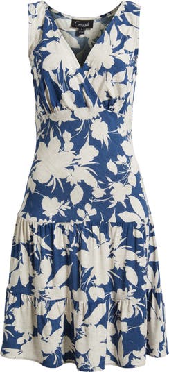 A flouncy frill adds fluttering movement to this lightweight sleeveless dress covered in a bloom print and topped with a wrapped bodice.