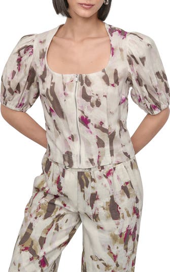 Charming puff sleeves frame this lightweight linen-blend top designed with a lively print and an edgy front zip.
