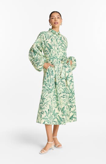 This midi shirt dress features a button-down front and classic collar, combining timeless tailoring with modern ease. Long balloon sleeves and a detachable waist tie offer versatile styling for both casual and polished looks. Featured in TOILE OLIVE, this print was inspired by Miami’s gardens, sketched and digitally mirrored through algorithmic repetition. Its olive tones evoke calm and continuity, like sunlight filtering through leaves.