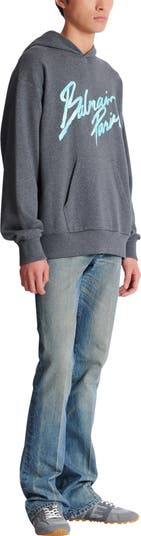 Cotton jersey hoodie Long sleeves Adjustable hood with drawstring Balmain Attitude print on the front Relaxed fit Model measures 187cm and wears a size M Main material: 100% cotton Made in Italy Item: GH1JT252BD43 100% of the cotton fibres used to make this garment are certified and organically farmed
