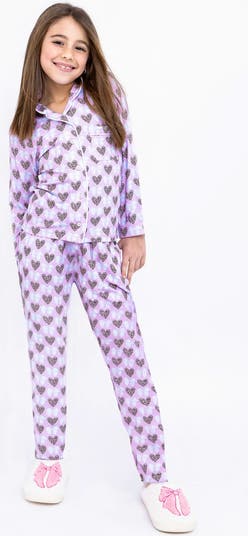 A silky soft heart printed jersey loungewear set featuring a long sleeve button-up top and matching pants with elastic waist.