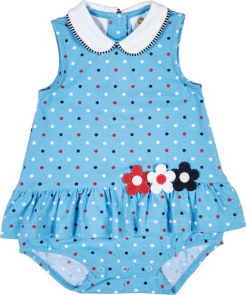 A joyful nod to classic Americana, this romper is crafted from soft jersey knit printed with medium blue, red, white, and navy dots‚Äîperfect for sunny summer days. Appliqué flowers add a playful pop, while the crisp white Peter Pan collar trimmed in navy and white stripe cording brings timeless charm inspired by heritage style. Designed for comfort and movement, the sleeveless silhouette features a softly shirred skirt ruffle and elastic leg openings, with back and inseam snaps for easy changes. Whether she‚Äôs watching a parade, celebrating the Fourth of July, or enjoying summer festivities with family, this piece is made for moments worth remembering.