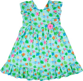 Sunny and full of island charm, this dress is crafted from tropical print linen-look woven in soft, breathable 100% cotton—perfect for warm-weather getaways. A bright pink appliqué hibiscus flower blooms at the front waist, while ruffled shoulders add playful movement and a feminine touch. Designed in a classic waist dress silhouette with a softly shirred skirt, it offers comfort and easy elegance. Finished with a back invisible zipper and falling to the knee, it’s ideal for vacation dinners, seaside strolls, and picture-perfect days in the sun.