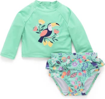 Our Long Sleeve Rashie Set for the sweetest swim and sun protection! Featuring a long sleeved top and a matching ruffle bottoms with elasticised waistband for easy dressing. Made from a recycled polyester and elastane blend for a lightweight and breathable set. Available in 2 sweet prints. Outer: Made from 86% Recycled Polyester/14% Elastane. Purebaby Swim has been consciously designed with an awareness of our impact on the ocean and the environment. All styles are made from Repreve fabric, which is created using recycled post-consumer products and other ocean landfill.
