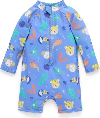 Make a splash this summer in our Long Sleeve Rashie Sunsuit! Designed with long sleeves and short legs for additional coverage from the sun, a front zip for easy dressing and an all over print. Made from recycled polyester and elastane blend for a lightweight and breathable suit. Made from 86% Recycled Polyester/14% Elastane Lining made from 100% Polyester. Purebaby Swim has been consciously designed with an awareness of our impact on the ocean and the environment. All styles are made from Repreve fabric, which is created using recycled post-consumer products and other ocean landfill.