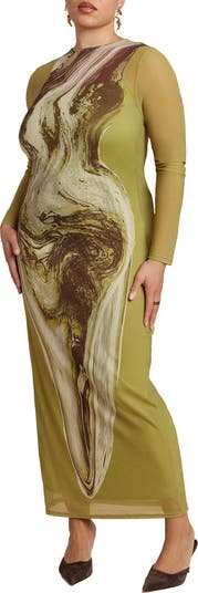 Step into sleek confidence with this printed mesh maxi dress that contours the body beautifully. A sheer overlay and adjustable slip lining create ease of wear and subtle dimension.