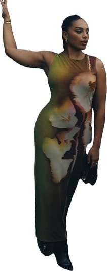 An abstract print reminiscent of a heat map raises the intensity of a figure-clinging maxi cut from airy, stretchy mesh.