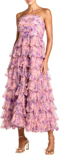 Strapless pink floral midi dress with layered ruffle tulle skirt and fitted bodice. Romantic, feminine statement piece perfect for weddings, parties, and special events.