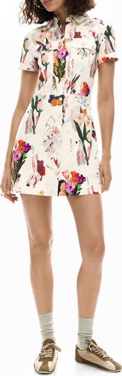A mix of photorealistic floral prints amp up the edge of this soft crepe shirtdress designed in a fit-and-flare silhouette.