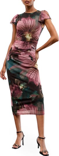 Flutter sleeves and lifelike blooms bring fresh energy to this ruched midi dress made of curve-hugging mesh.
