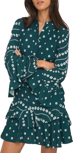 Playful yet polished, this printed mini dress features a rich, allover dot motif with softly ruffled tiers that add movement and dimension. Designed with a relaxed split neckline and long sleeves finished with flounced cuffs, it delivers an easy, feminine silhouette that transitions seamlessly from daytime outings to evening plans.